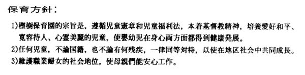 かしのき保育園は、児童憲章と児童福祉法に基づいて、キリスト教精神による、平和を愛する美しい豊かな心をやしない、乳幼児の心身の発達をめざして保育します。